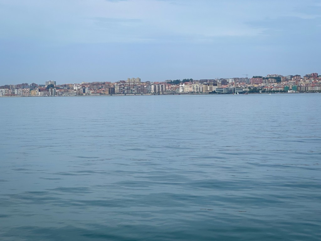 Today was a relatively short walking day, but not without its challenges. Our route took us along freeways, city streets, and eventually the beach, before we boarded a ferry into Santander. The weather has started heating up again—temperatures hovered in the 90s with heavy humidity, making the beach stretch particularly grueling.